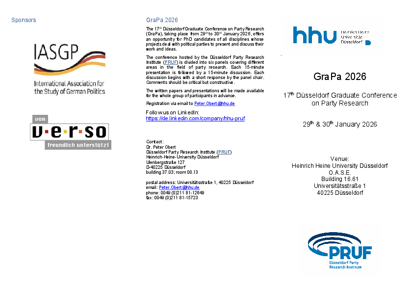 Am 29. und 30. Januar 2026 findet zum 17. Mal die Düsseldorfer Graduiertenkonferenz Parteienwissenschaften des PRUF statt. Die zweitägige, interdisziplinäre Veranstaltung an der HHU bietet Promovierenden auf dem Gebiet der Parteienwissenschaften die Gelegenheit, ihre Projekte und Ideen zu präsentieren und zu diskutieren. Das PRUF freut sich, mit den Vortragenden aus dem In- und Ausland im Rahmen der vielfältigen Panels in den Austausch zu treten. Das Konferenzprogramm als pdf-Datei finden Sie [hier].